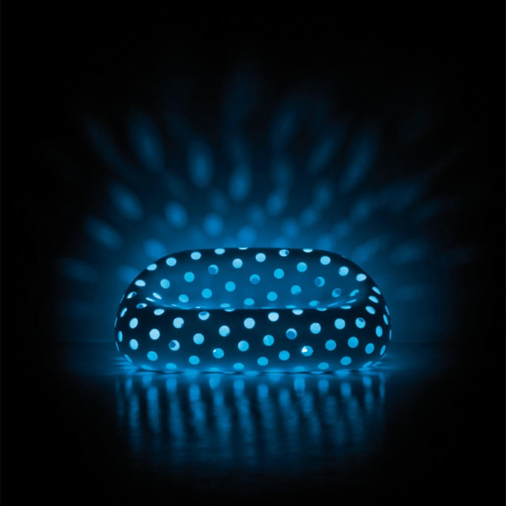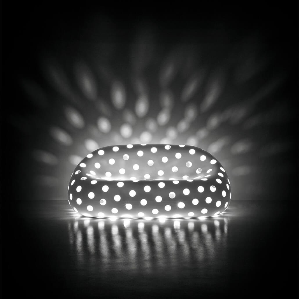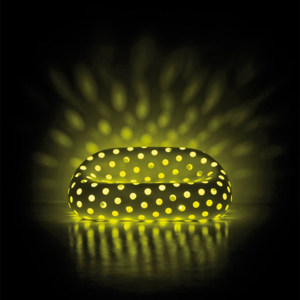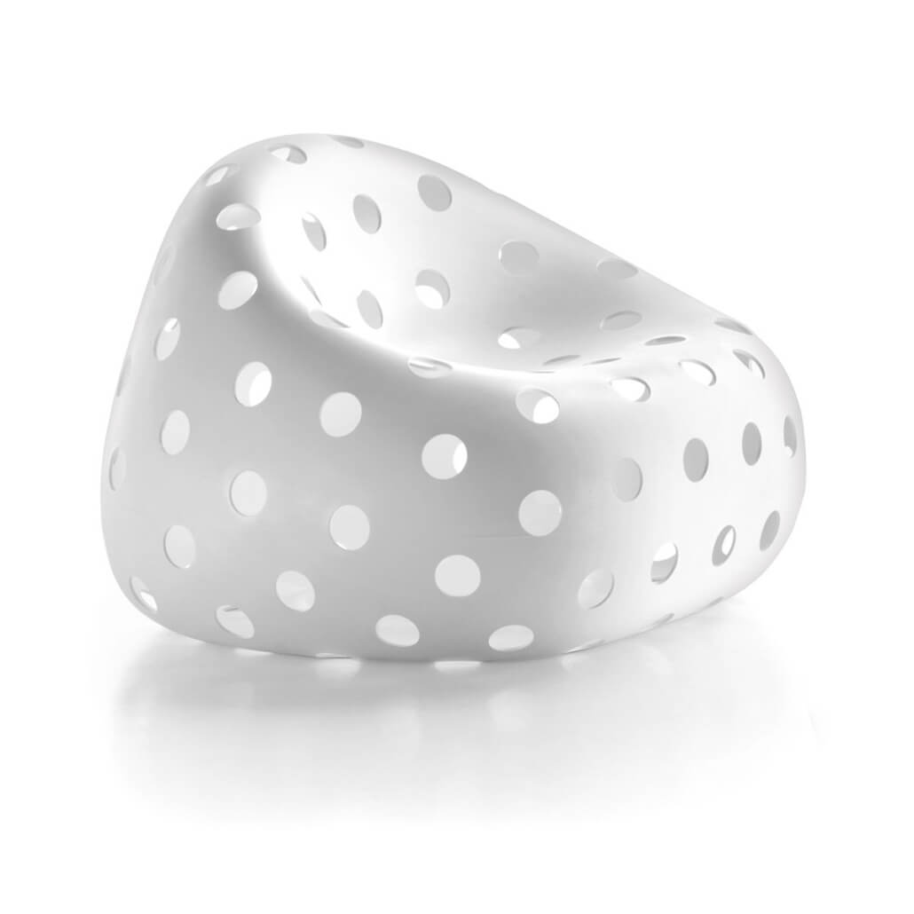 El sillón “Airball Armchair” y el sofá “Airball Sofa” descienden de la familia “Gumball”, de gran impacto escénico y adecuados para entornos que requieren soluciones de fuerte personalidad. La superficie perforada con “vacíos” otorga a los objetos una ligereza inédita para este tipo de muebles decorativos.