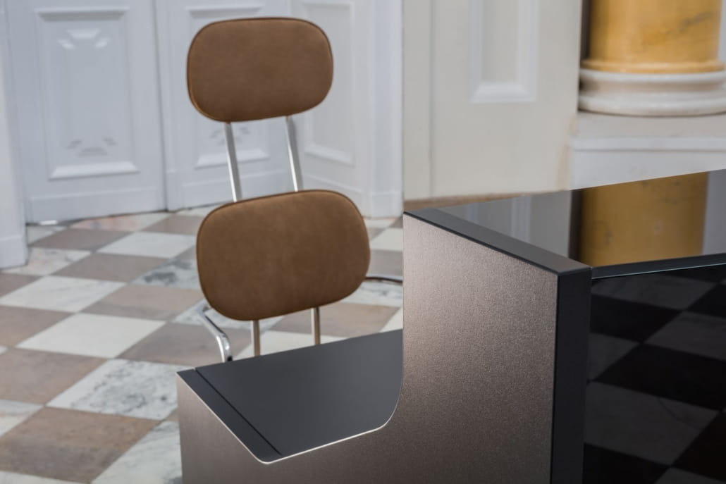 Lujosa, pero clásica al mismo tiempo, Alpa atrae la atención de los visitantes y crea un clima de confianza. Los frontales de vidrio brillante y sus colores atemporales destacan su seriedad, que resalta adicionalmente por la iluminación del zócalo de metal.