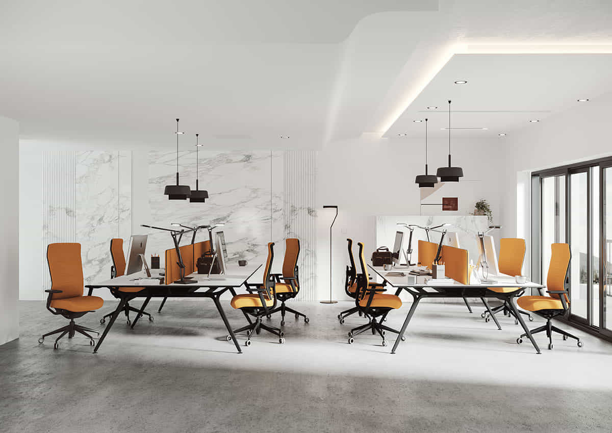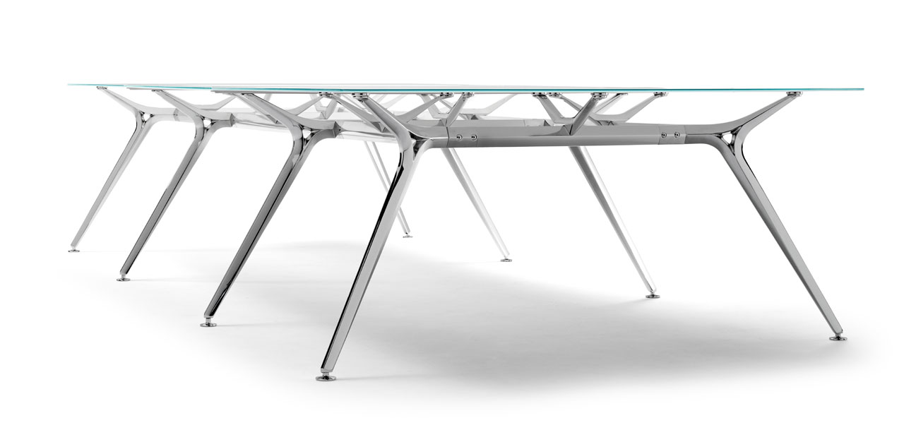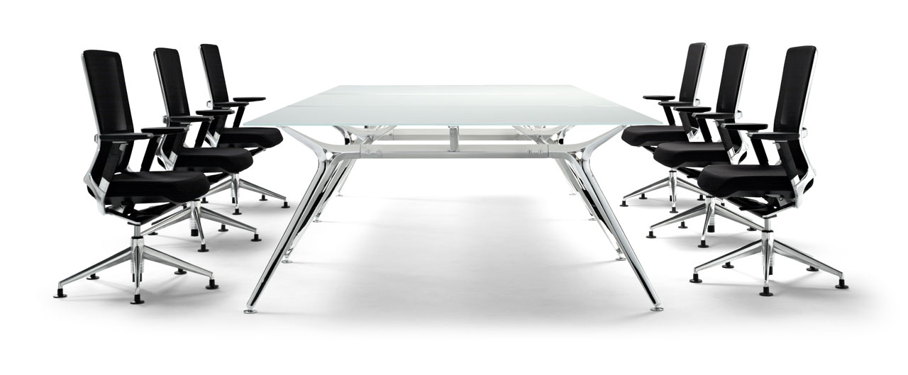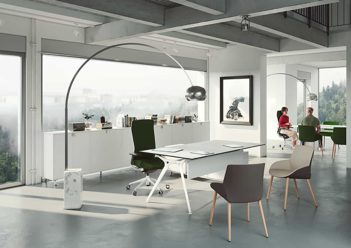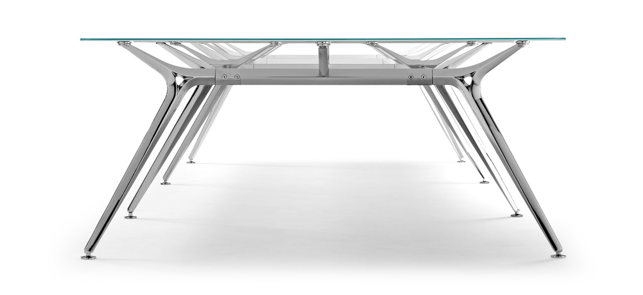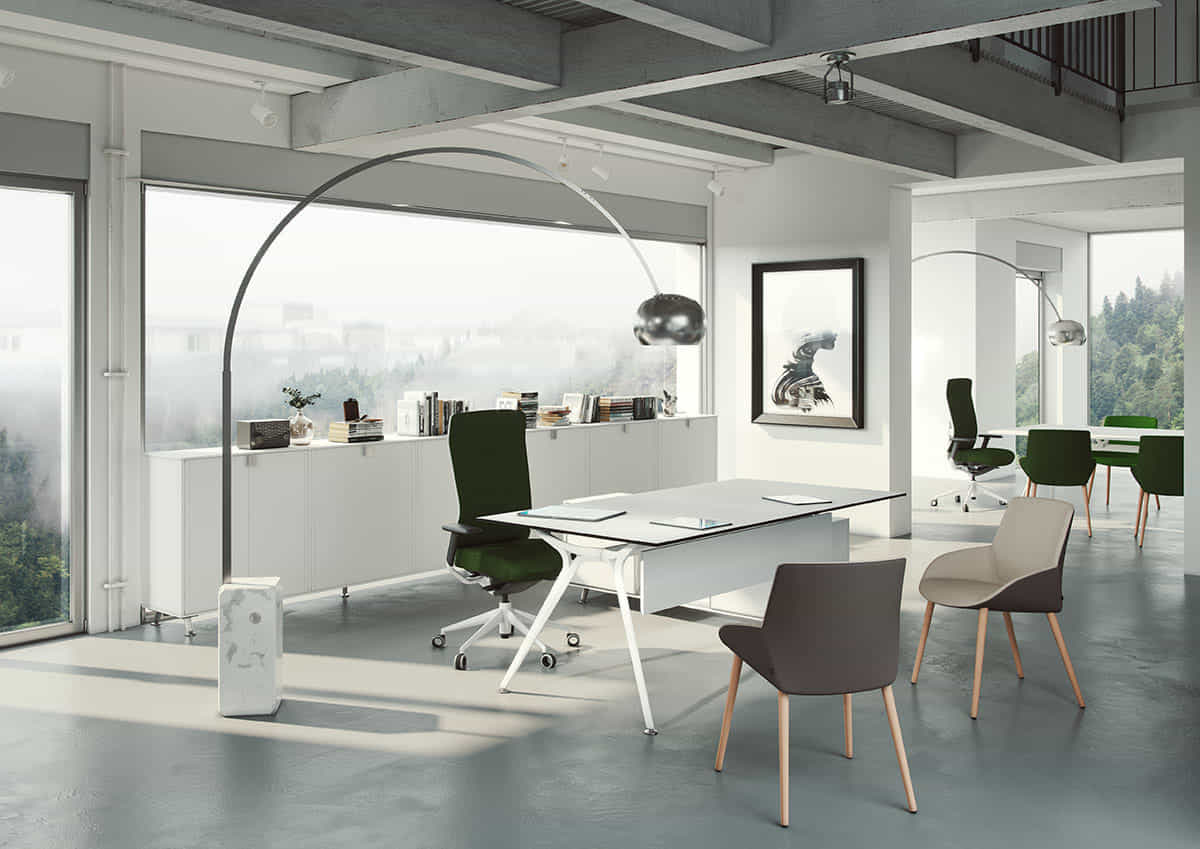 Su lado más vanguardista y exclusivo se demuestra en mesas de dirección ydespachos personales. Una estructura robusta que suspende en el aire un delgado plano de trabajo.