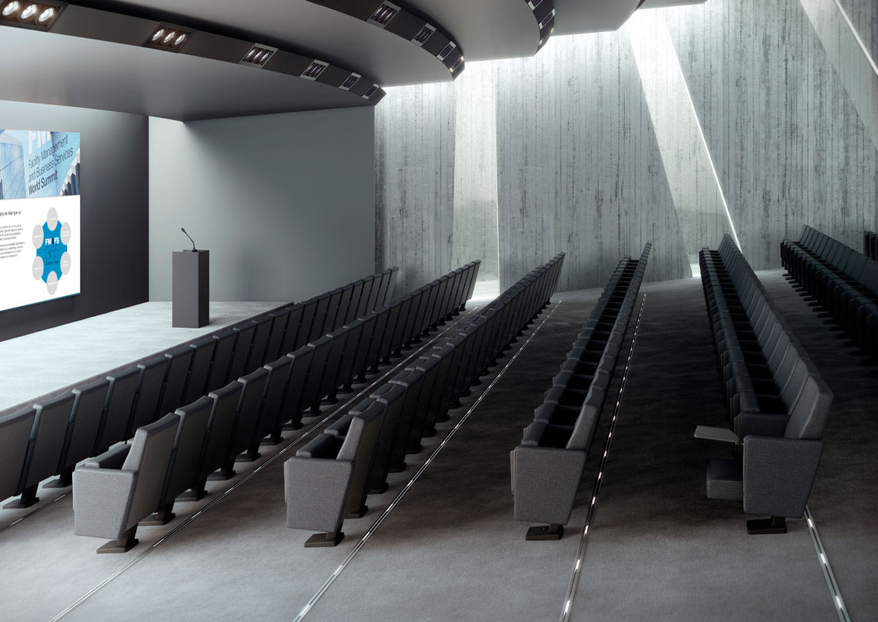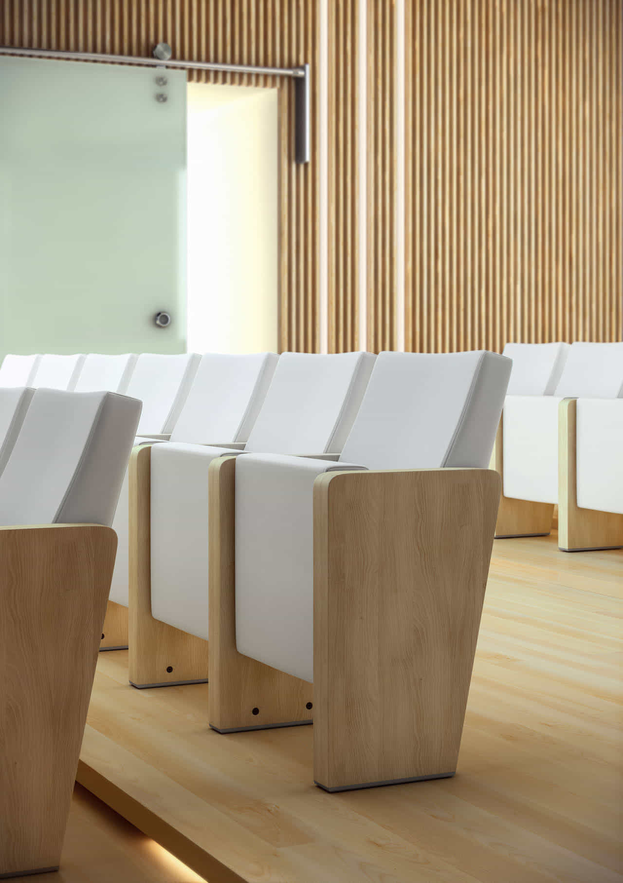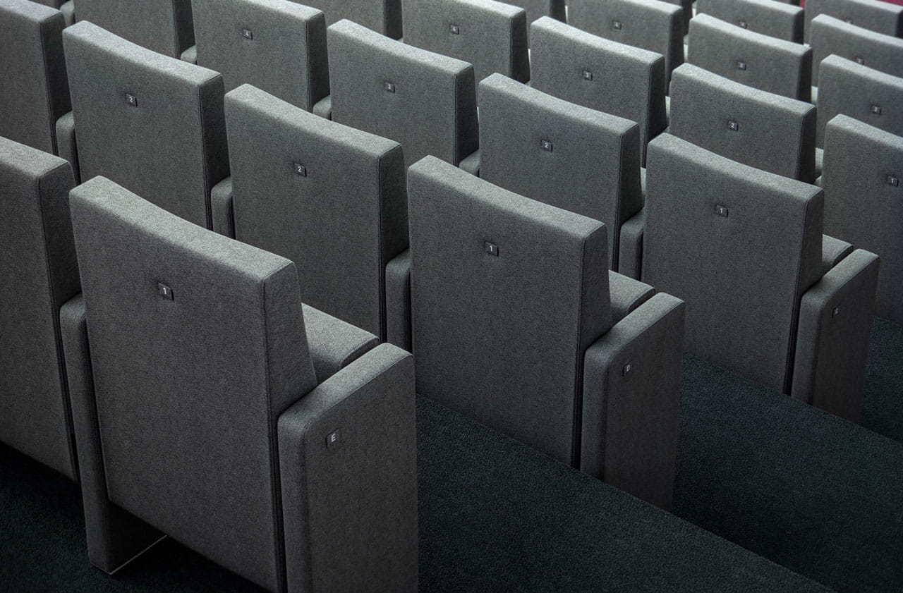 Butacas para auditorios, teatros, palacios de congresos y espacios multifuncionales. El programa ofrece una gama de medidas normalizada que permite, a su vez, desarrollar productos específicos para proyectos que lo requieran.