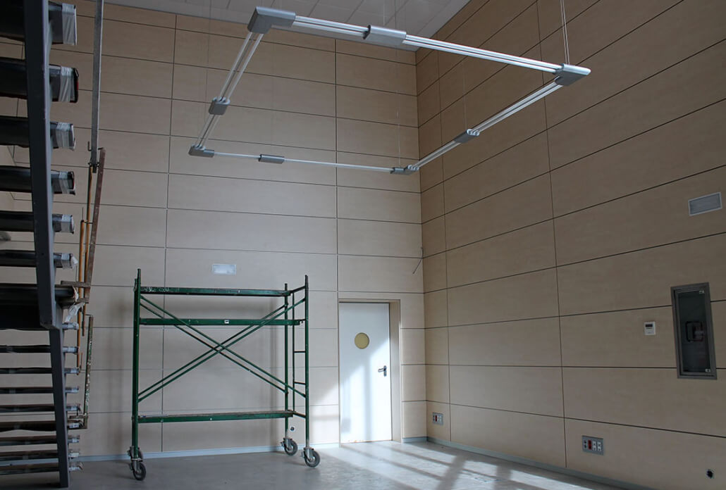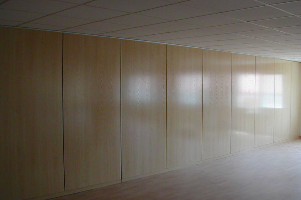 MECUX realiza el forramiento con un sistema formado por una estructura autoportante de aluminio que soporta un panelado de 16 mm. Modulando según gustos del cliente. Tras la estructura autoportante se pueden alojar cualquier tipo de instalaciones según necesidades de la oficina.