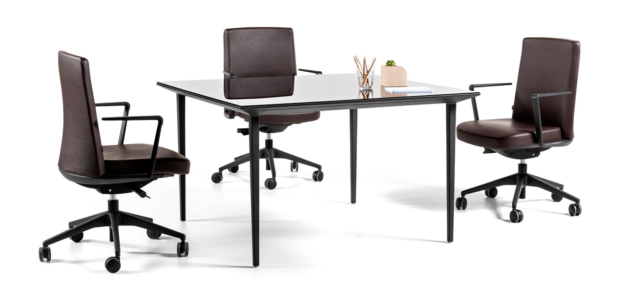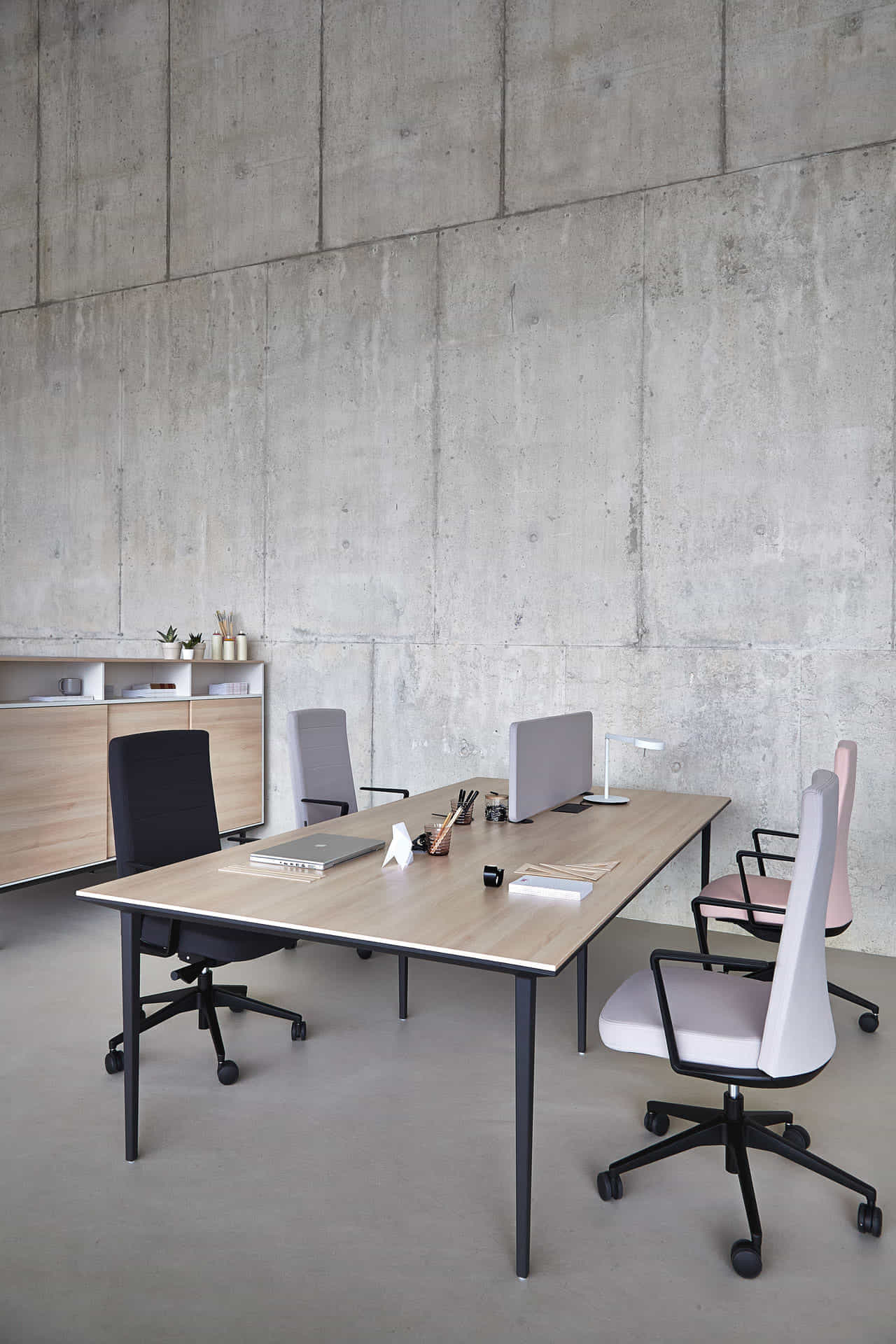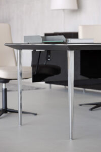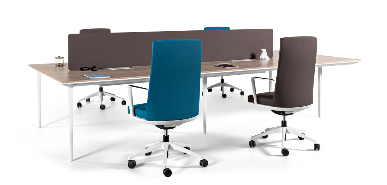 Las mesas Longo, disponibles tanto para soluciones operativas como para dirección, combinan el aluminio extrusionado de la estructura, con la inyección de aluminio de las patas y puntos de unión. La elección de este material junto con su diseño, le otorgan un aspecto ligero, suave y coherente con el resto de elementos con los que se fusiona: armarios, librerías, sofás o divisorias fornoabsorbentes.