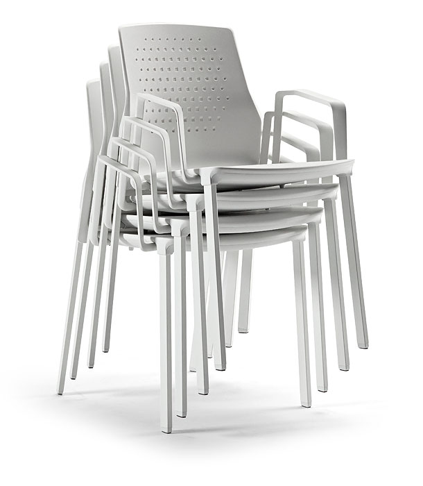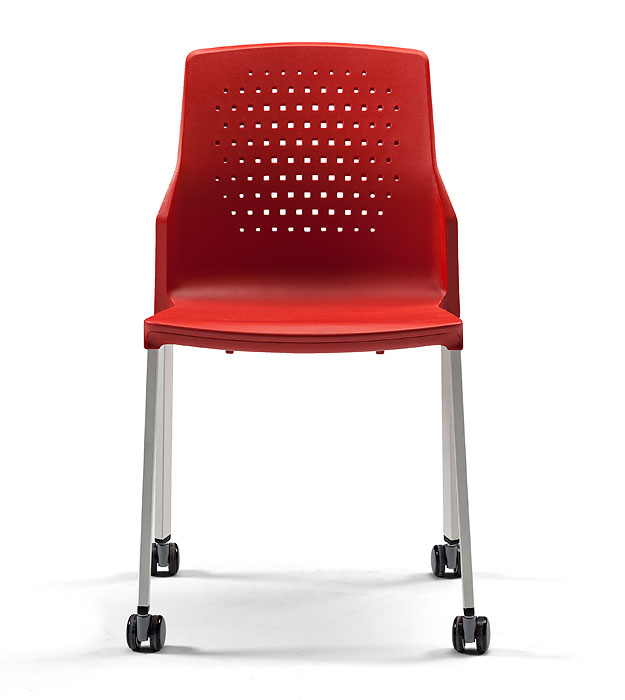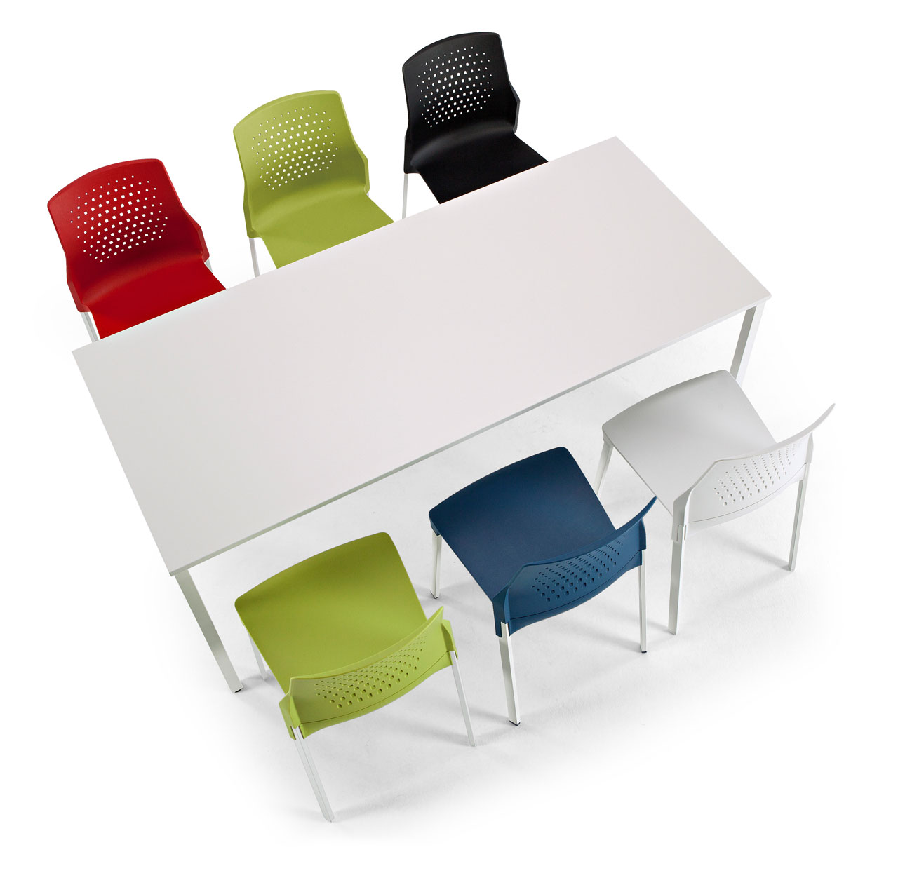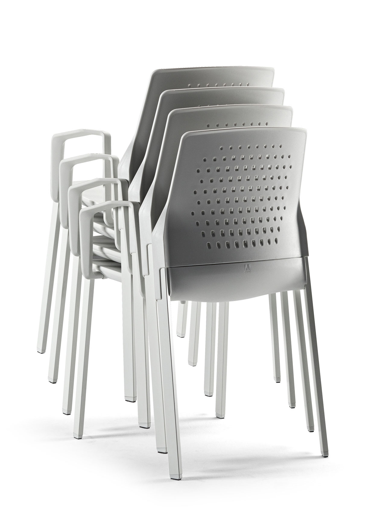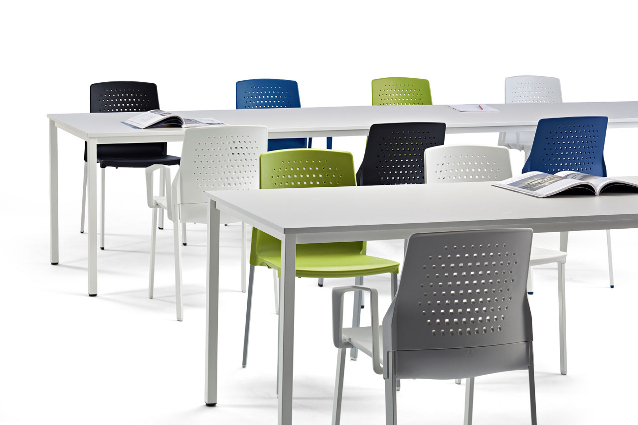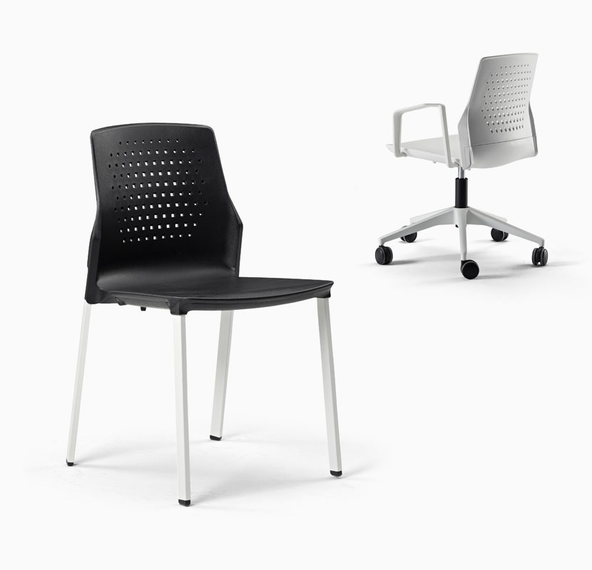 Silla versátil, ligera y de fácil almacenamiento, de líneas fluidas y vanguardista, montada sobre una estructura metálica que se adapta a cualquier necesidad de uso. Su textura transpirable aporta una perfecta sujeción lumbar.