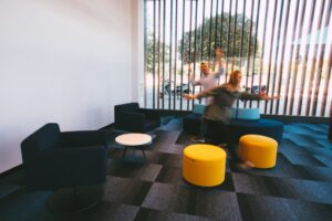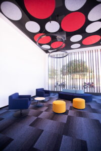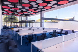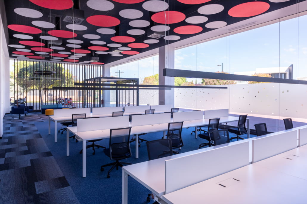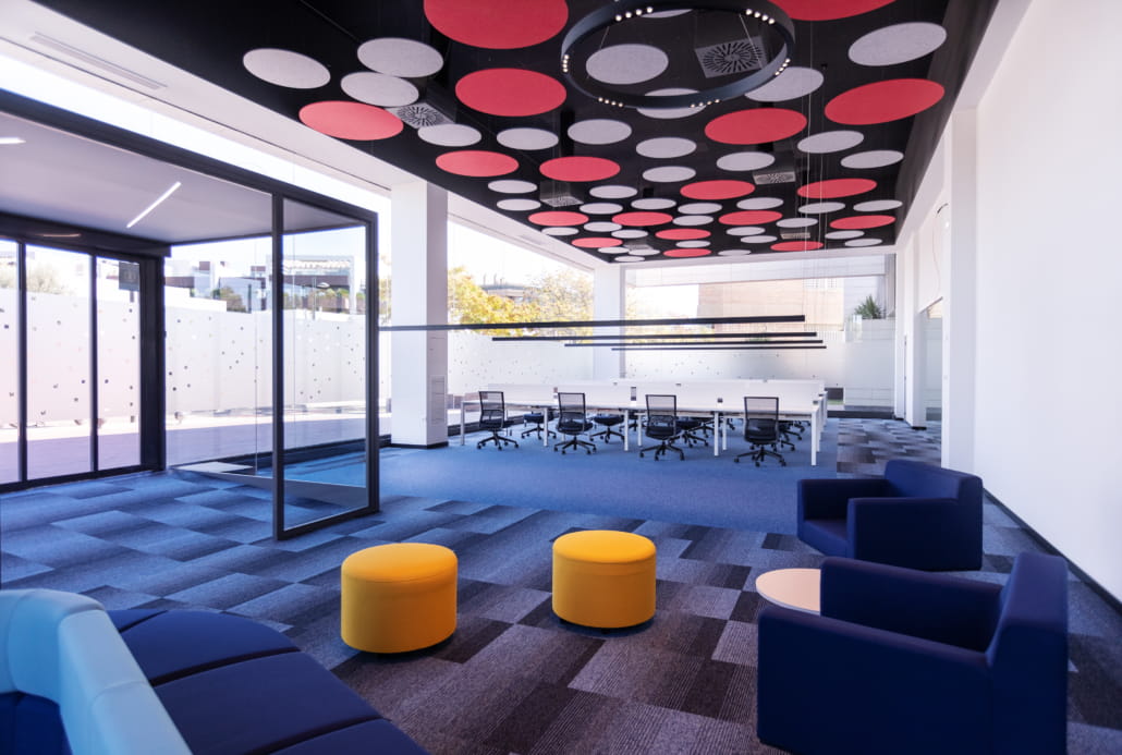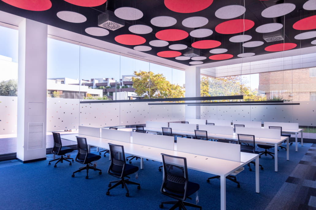 - Mejorando la reverberancia en la sala con paneles acústicos suspendidos del techo, implantando moqueta para mitigar el ruido de las pisadas, así como divisorias de sobremesa y vinilos en el escaparate que focalizan al usuario en su función.