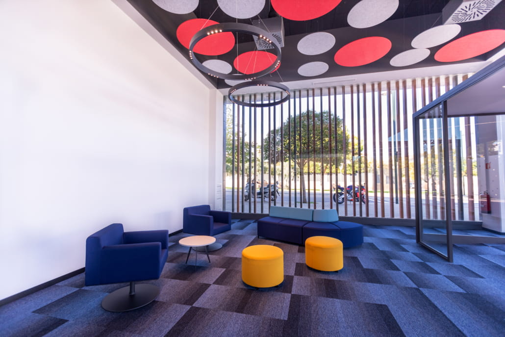 - Además, todas estas mejoras técnicas han redundado en una mejora estética percibida, dando una imagen más actual y homogénea a la instalación. Se ha conseguido dar vida al espacio jugando con los tonos azules de la moqueta, en contraposición con los acabados rojos del techo, pero integrados ambos: en el caso de la moqueta, con los acabados de la sillería; y en el de los paneles acústicos blancos, con el mobiliario.