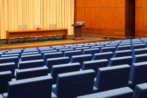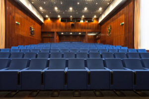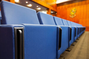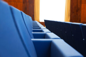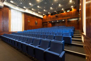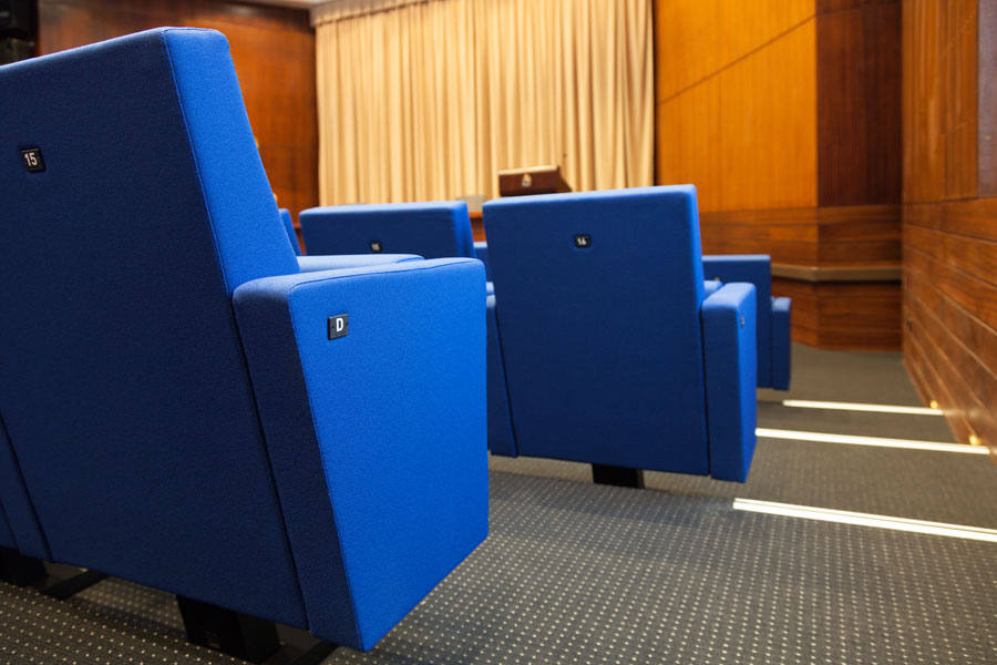 Para este proyecto se ha elegido la butaca con pie central, anclada sobre ángulo recto, con tapicería ignífuga en azul, numeración y brazos de terminación y con identificador de fila incorporado al lateral.