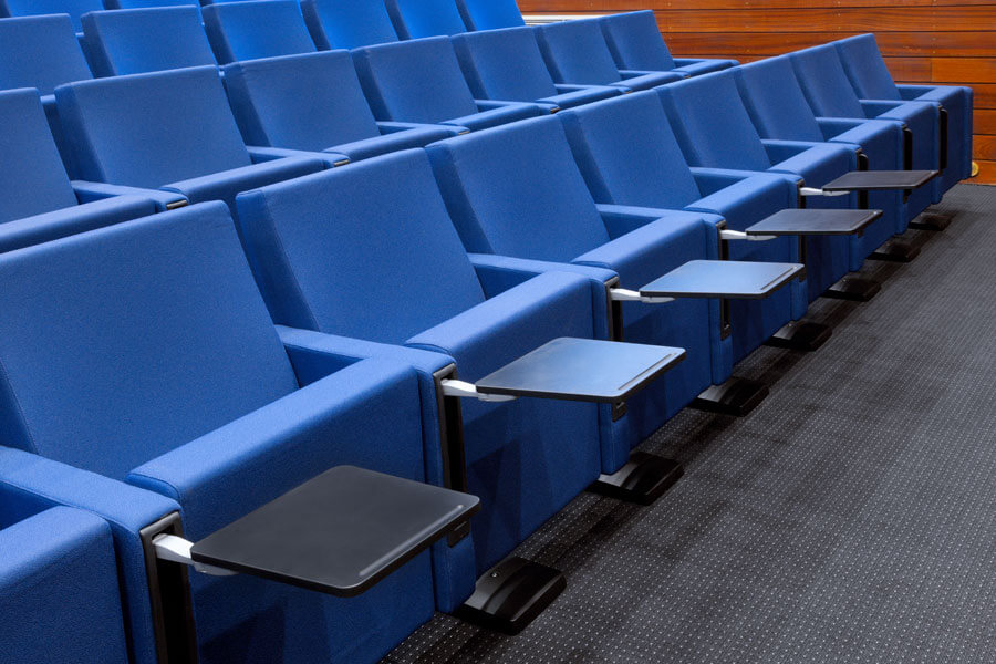 Además, cada asiento lleva incorporada una pala de escritura que queda oculta en un lateral del reposabrazos cuando está plegada. Una vez desplegada, la pala de escritura proporciona una superficie de apoyo estable y cómoda.