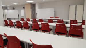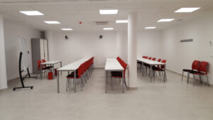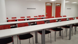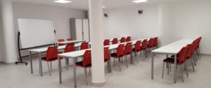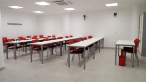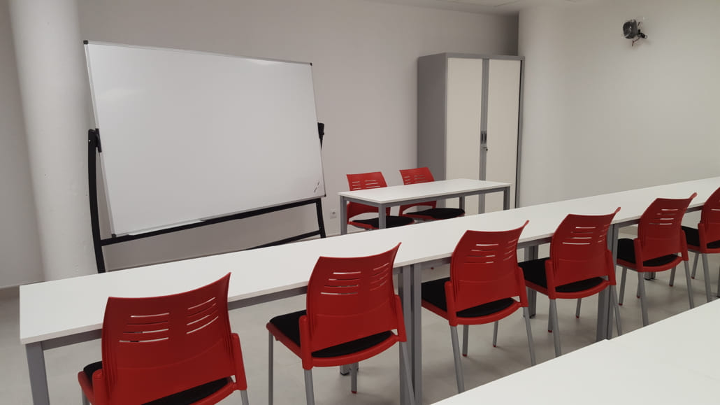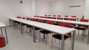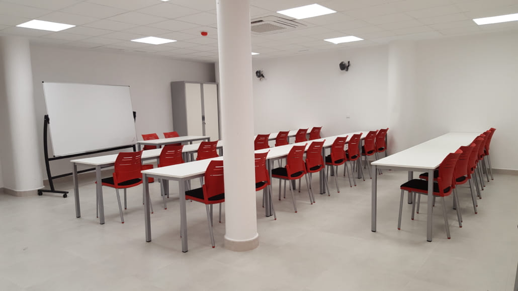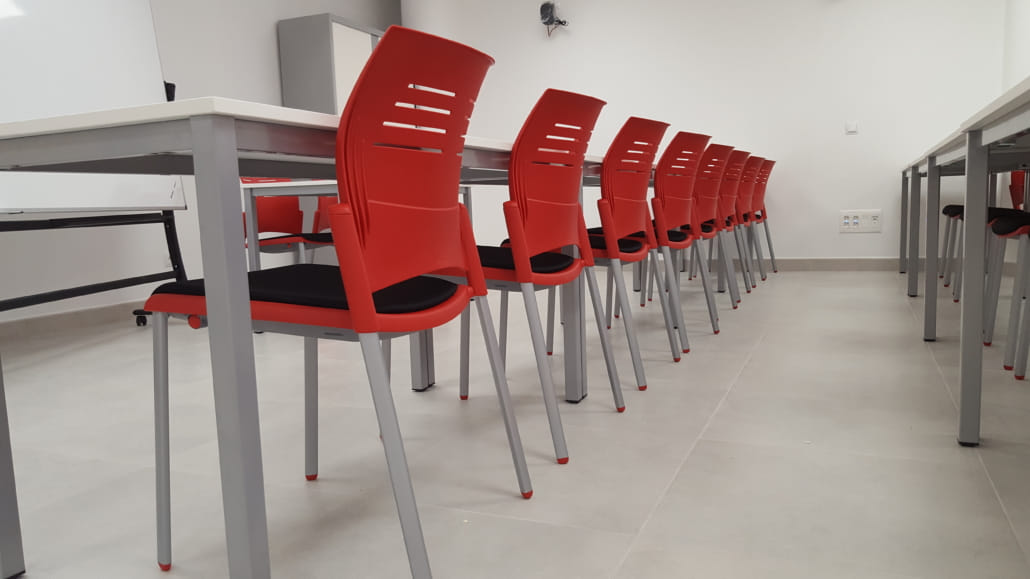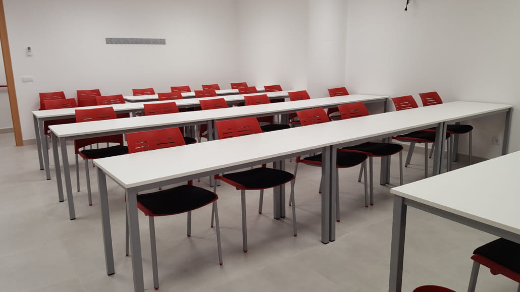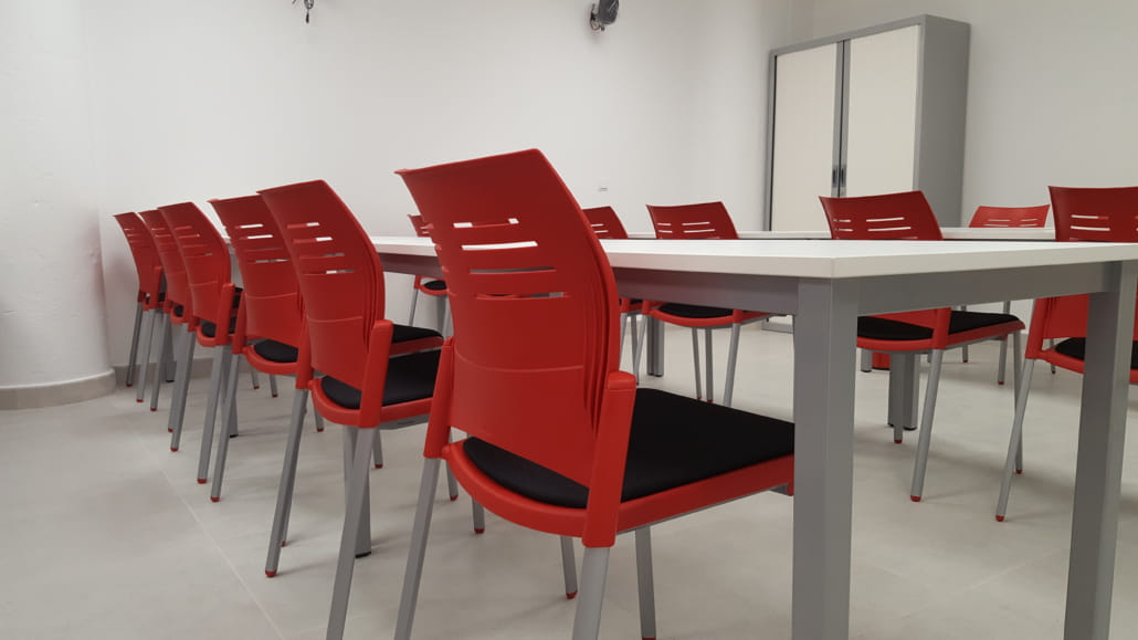 En el Centro de Formación de la CRUZ ROJA, se han equipado varias instancias con un mobiliario polivalente de fácil reorganización y apilable. En las sillas se aconsejo tapizar el asiento para mayor comodidad del usuario y el resultado ha sido muy satisfactorio. Los propios alumnos nos han felicitado por la comodidad de las sillas. La imagen que proyectan las salas de formación era parte fundamental para la CRUZ ROJA, por ello se eligieron acorde con los colores corporativos de la organización.