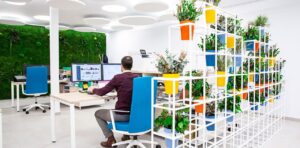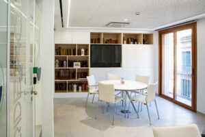 Para optimizar el espacio de trabajo, se ha reunido a todo el personal en la planta baja y la entreplanta, donde la excesiva compartimentación original ha dejado paso a nuevas y luminosas áreas diáfanas. En ellas, la vegetación se incorpora al diseño, a través de una estructura metálica con plantas suspendidas en su interior y un jardín vertical como telón de fondo.