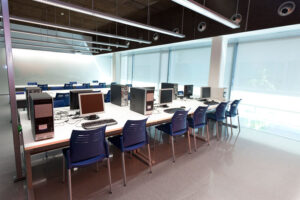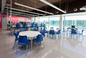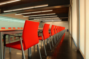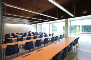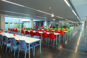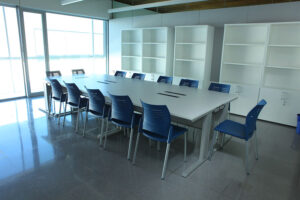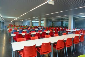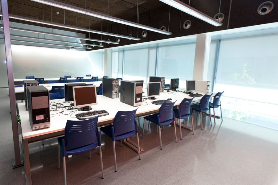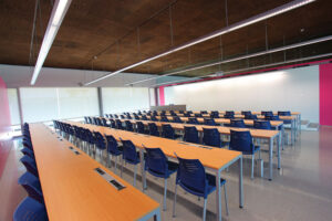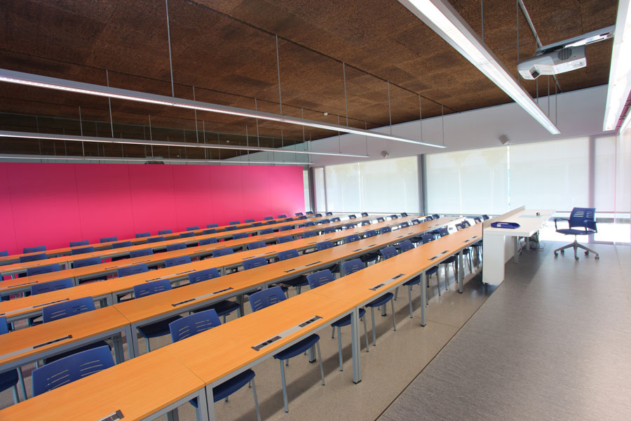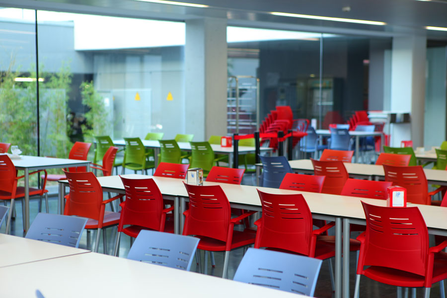 La silla Spacio, ligera y funcional, es una solución acertada para equipar entornos públicos y con un uso intensivo, como es el caso de los numerosos laboratorios, polivalentes y específicos, con los que cuenta la nueva ETSE-UV. Para este proyecto se ha utilizado el modelo de cuatro patas y la banqueta, ambos sin brazos para una mayor agilidad de movimientos. La mesa Dynamic en su versión hexagonal para colectividades permite trabajar cómodamente en grupos.