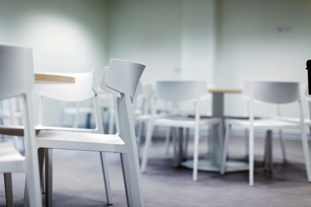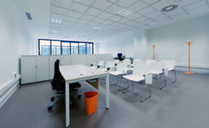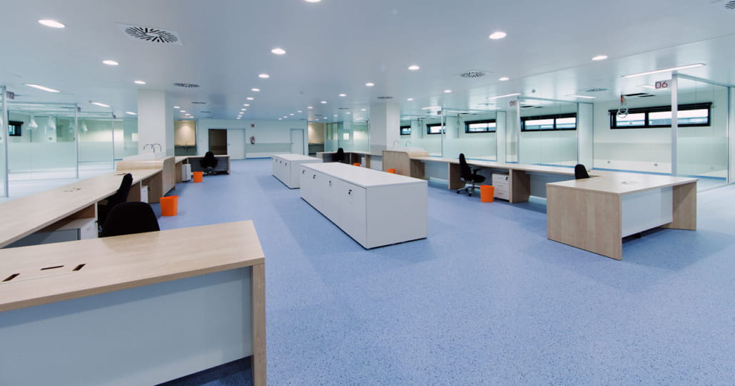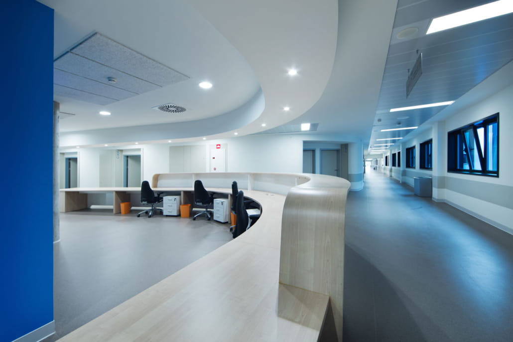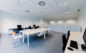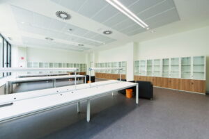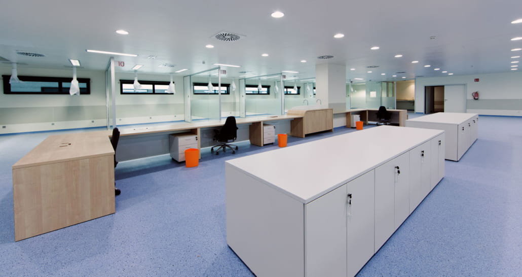 El programa de mesas VITAL PLUS ha sido el elegido para amueblar las zonas de consulta, salas de formación y docencia o la biblioteca, entre otras. En cada caso, se ha adaptado la mesa a las necesidades y estética del espacio. Además, estas mesas se han instalado en este caso con luminaria y sistema de electrificación, accesible desde el mismo sobre de la mesa, para poder conectar todo tipo de dispositivos electrónicos. Los armarios, instalados a lo largo de toda la pared, se han combinado con madera y cristal, consiguiendo aportar elegancia y dejando a la vista una parte del contenido que albergan.