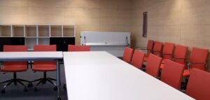En las salas de reunión se ha instalado la mesa Arkitek, con su impactante estructura cromada y superficie en vidrio negro. Le acompaña la elegante silla Ikara, de formas limpias y esbeltas, con acabado en madera lacada e interior tapizado en piel color crema. Una propuesta de mobiliario exclusiva, con una presencia visual selecta.