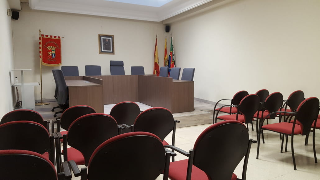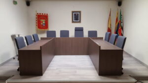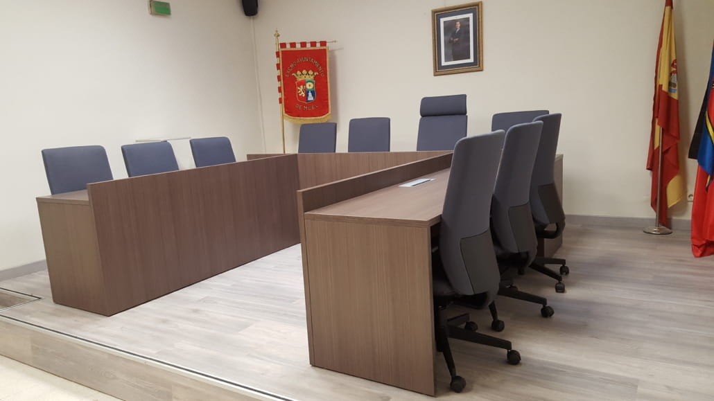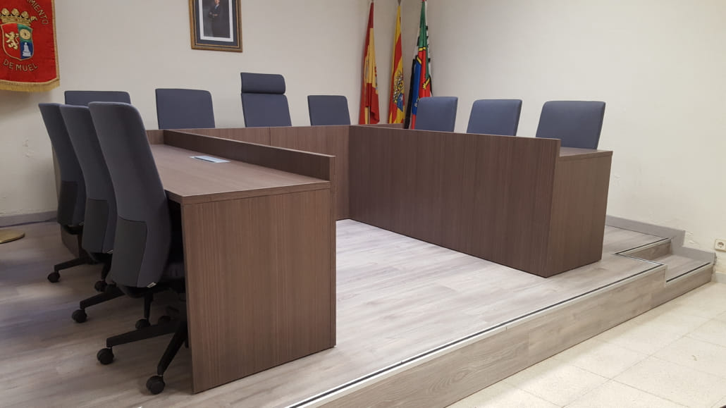 El Ayuntamiento de Muel eligió a MECUX para el equipamiento del Salón de Plenos. El proyecto se encaró con una idea clara, renovar la imagen antigua y dotar al nuevo Salón de Plenos de elegancia sin perder comodidad. En primer lugar, se instaló una tarima para que la mesa quedara más alta y fuera visible desde cualquier punto del Salón. Las mesas están dotadas de un sistema de electrificación oculto para que el cableado no quede a la vista. Las sillas debían de ser cómodas e incorporar brazos regulables en altura.