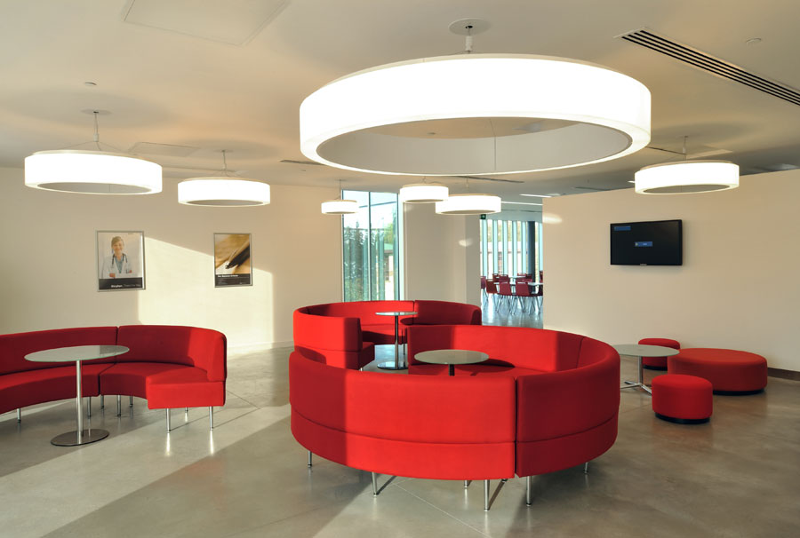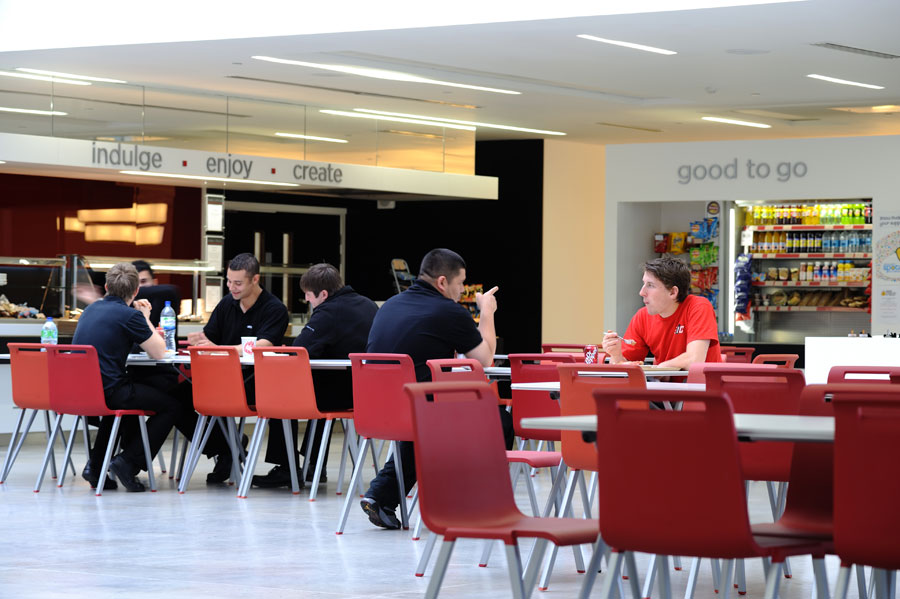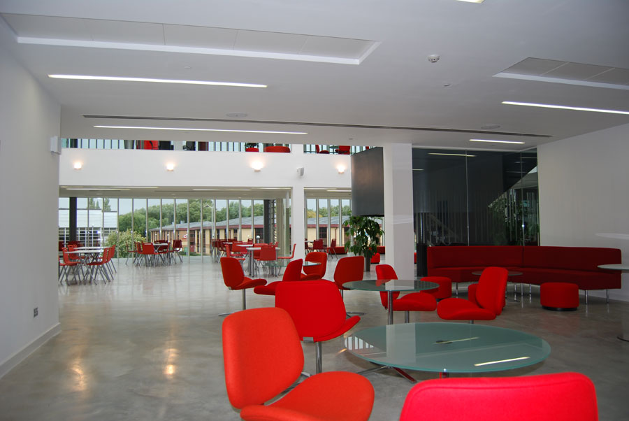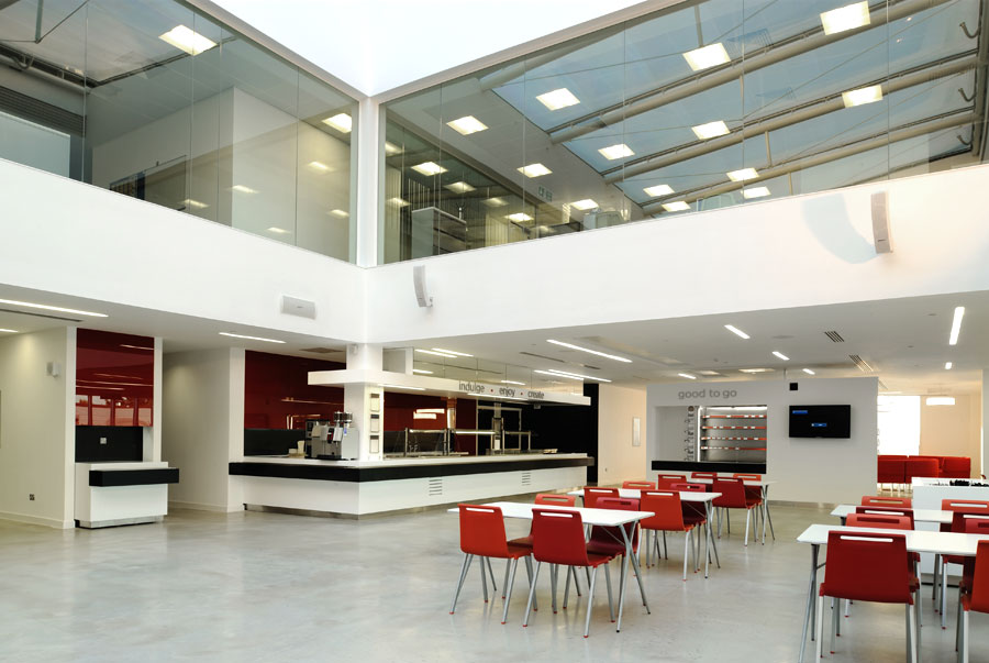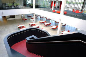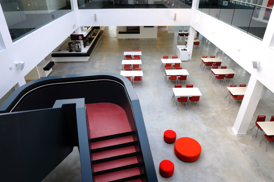 El cromatismo marca la distribución y funcionalidad de los espacios. Rojo para las zonas diáfanas, de paso, de espera, de descanso y ocio y verde para los entornos operativos. La zona de cafetería, amplia y luminosa, está equipada con las mesas Plek. Un producto altamente funcional y polivalente, muy recomendado para espacios de tránsito y afluencia de gente, como comedores públicos o formación.