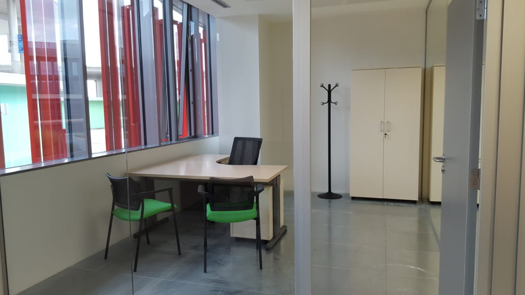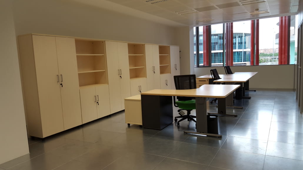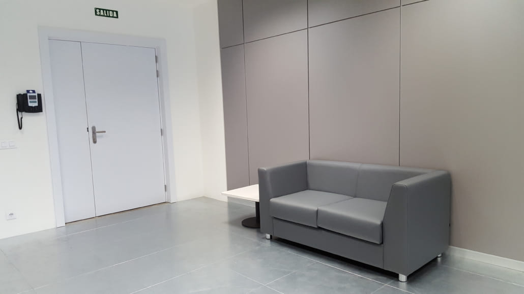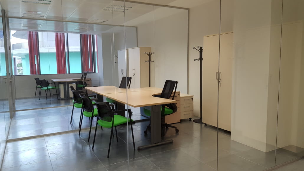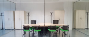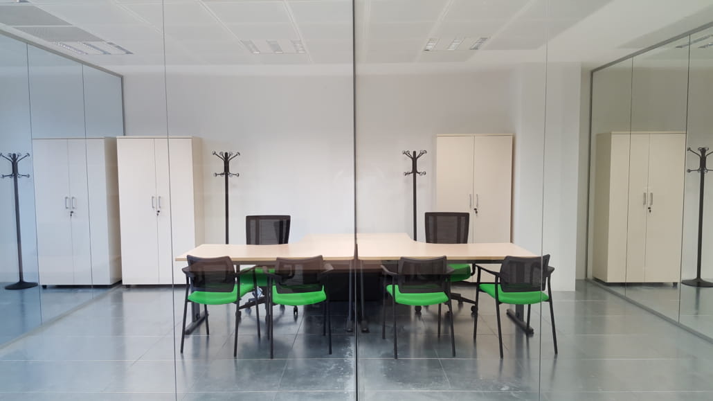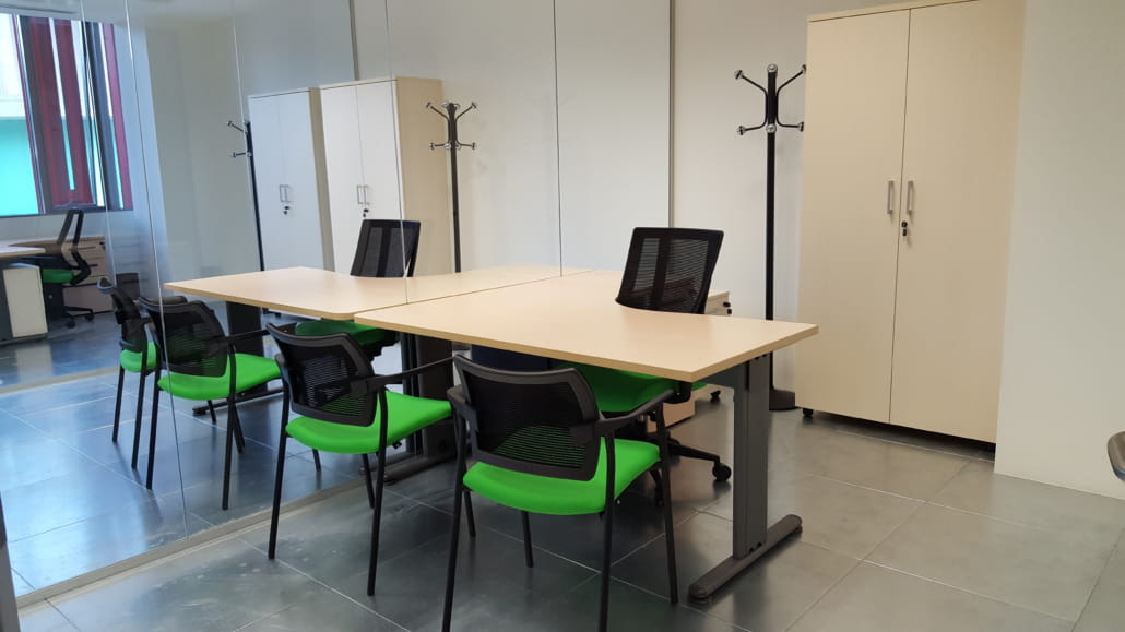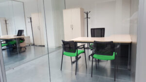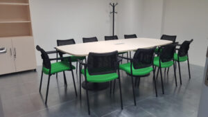 En la sillería se ha querido hacer un guiño al color corporativo de la empresa y se han tapizado los asientos de las sillas en color Verde, el respaldo se ha escogido en malla negra, para darle un confort superior.